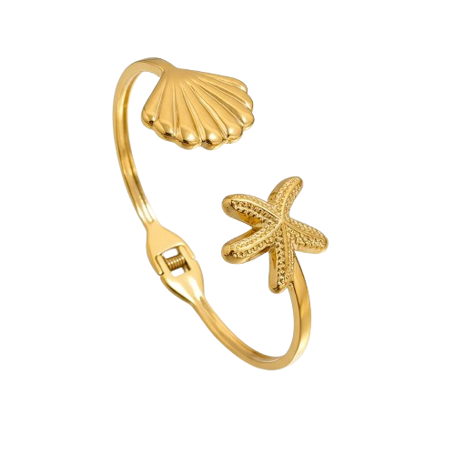 Bracelet Étoile de Mer en acier inoxydable, orné d’une étoile et d’un coquillage. Élégant et marin, symbole de voyage et de liberté.
